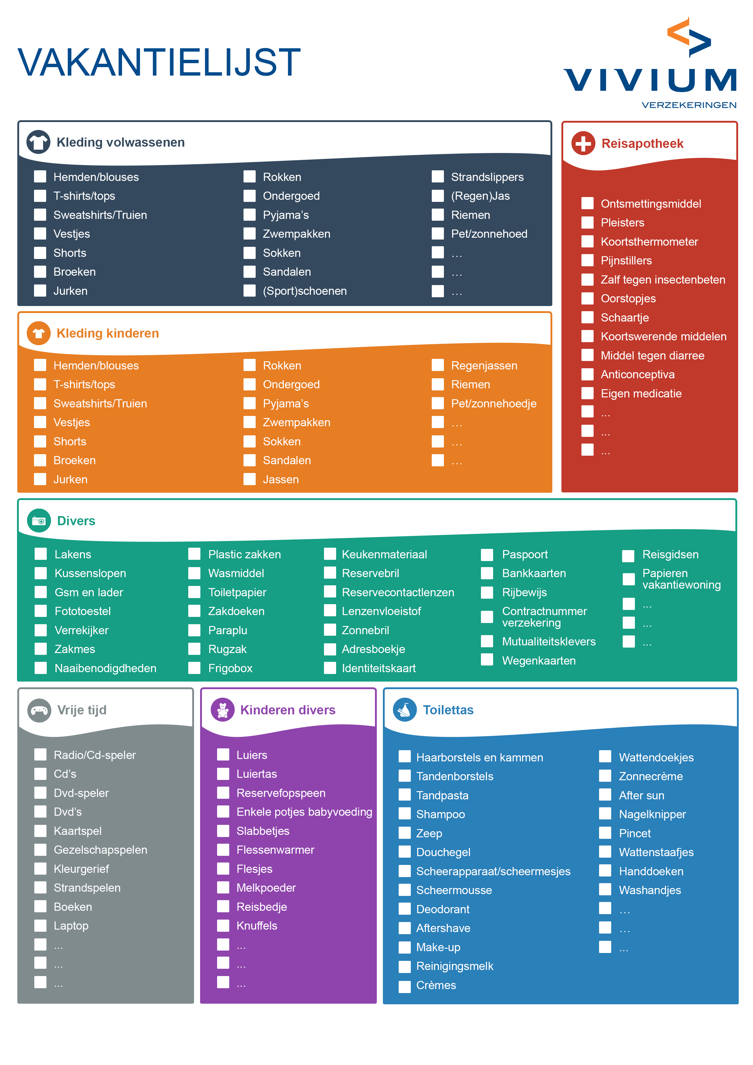 Altijd vervelend als u ter plaatse merkt dat er iets onmisbaars ontbreekt in uw bagage. Bijvoorbeeld de lader van uw fototoestel of gsm, de lievelingsknuffel van uw spruit,  Hierbij een handig lijstje dat u kunt uitprinten. Vul gerust aan waar nodig.